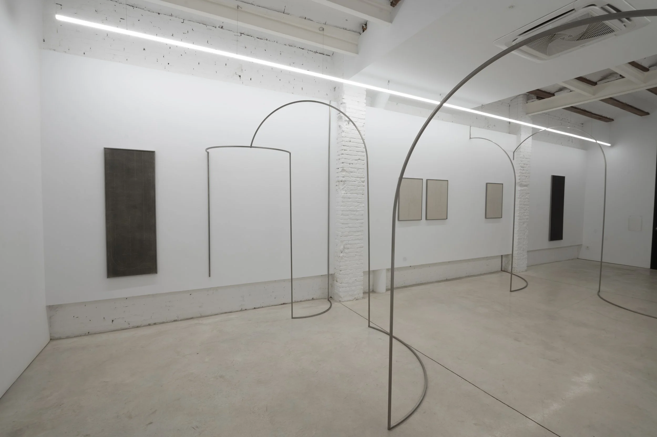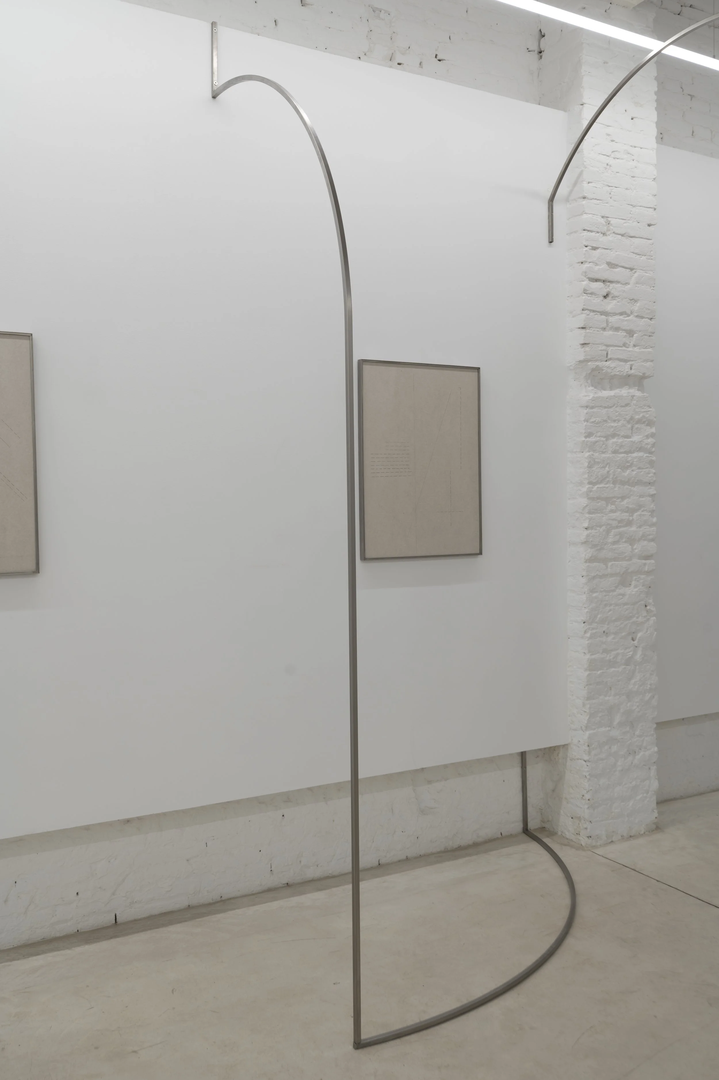 Las obras reunidas en Vangar se sitúan en el umbral entre gesto y arquitectura. La instalación dibuja en acero inoxidable un espacio transitable, hecho de rectas y arcos suspendidos en el aire. No es un objeto autónomo, sino un dibujo expandido en el que el visitante entra, pasa por debajo, rodea y mide con su propio cuerpo. «La escala no es magnitud, sino relación», recordaba Luigi Ghirri. Y también Anne Carson, que en Audubon (Men in Their Off Hours) escribió: